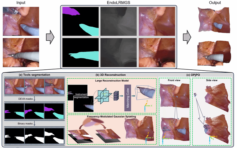 for complete surgical scene reconstruction. GS reconstructs deformable tissues and LRM generates 3D models for surgical tools while position